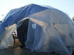 Please check out the Occupy Little Rock blog for ideas on the sleeping structure and warming method they are using. They are using a homemade geodesic dome tent with steel frame (homemade) and plastic and have a donated wood stove and a solar panel.